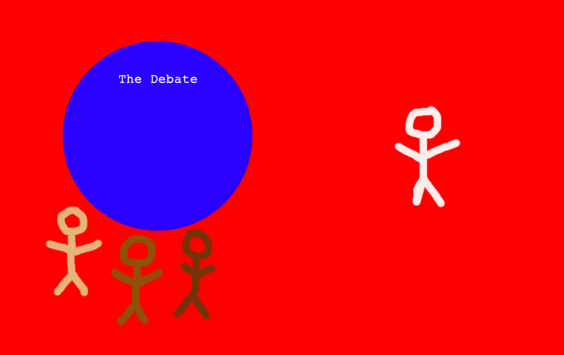 [Three stick figures (in shades of tan and brown) stand beneath a representation of a Debate, contributing to the Meaningful Issue with their Sharing of Personal Experience and Expression of Anger. A pale peach-colored stick figure off to the side sees this, reacts with a !!! of indignation, runs over, takes hold of the Debate, drags it away from the other stick figures, and jumps into the middle of it. We conclude on FUCK WHITE PEOPLE. :)]
