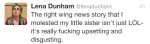 Lena Dunham’s actual response and justification of her sexually abusing her younger sister. i want to start off by saying that the site that originally posted the accusations is a right wing site, and not very reliable. however, all evidence has come from lena’s own book that she wrote. no one has twisted her words.