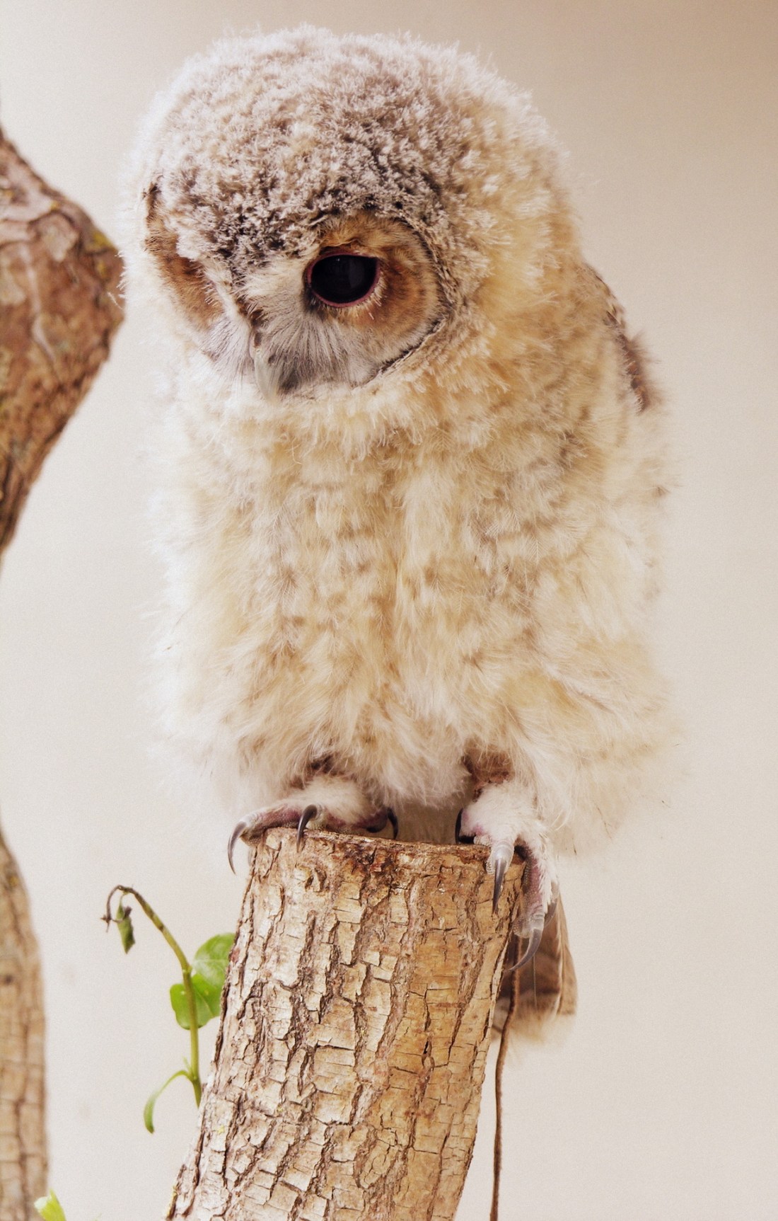 Baby Ezo ural owls are seen hanging out in a forest in Hokkaido, Japan